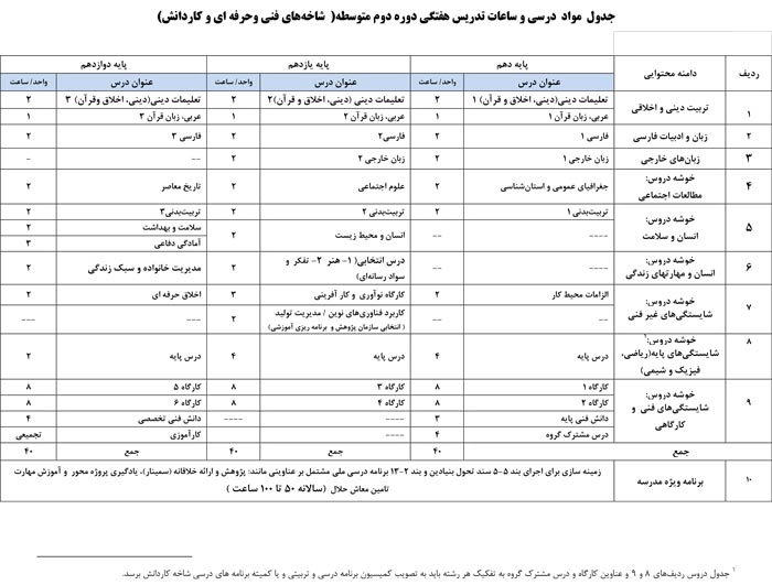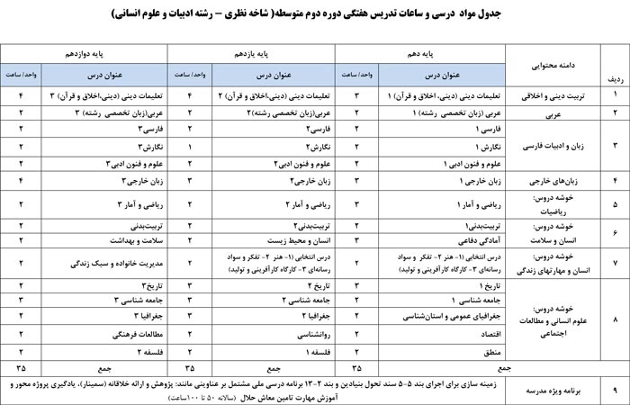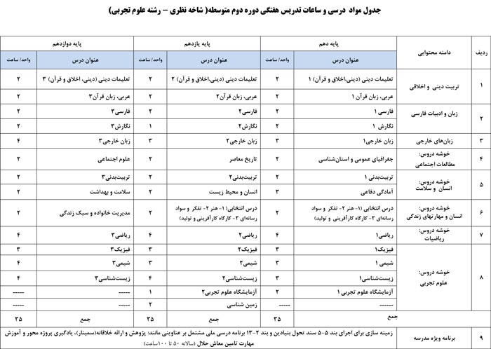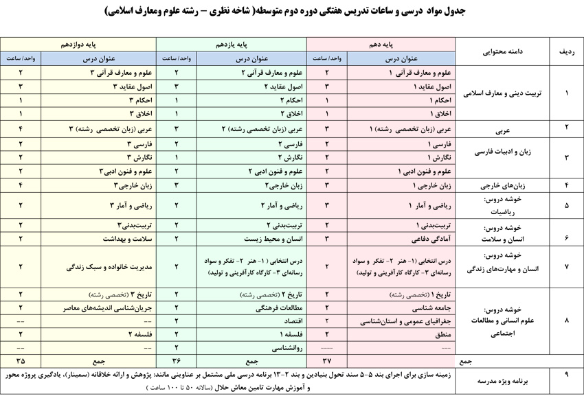 جدول مواد درسی و ساعات تدریس هفتگی دوره دوم متوسطه